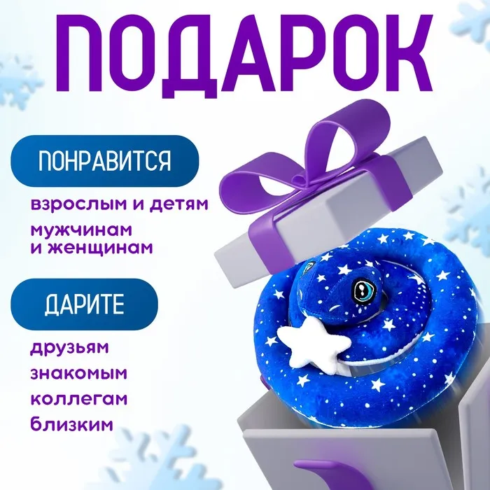 Мягкая игрушка в виде змеи станет отличным подарком на Новый год, ведь это символ наступающего года! Змейка украшена звёздами, а также у неё есть аксессуар в виде мягкой звезды. Такой аксессуар отлично впишется в интерьер и создаст атмосферу уюта и праздника. Разместите змею на полке, диване или используйте её для создания новогодней композиции. Эта игрушка станет отличным дополнением к новогоднему декору вашего дома.