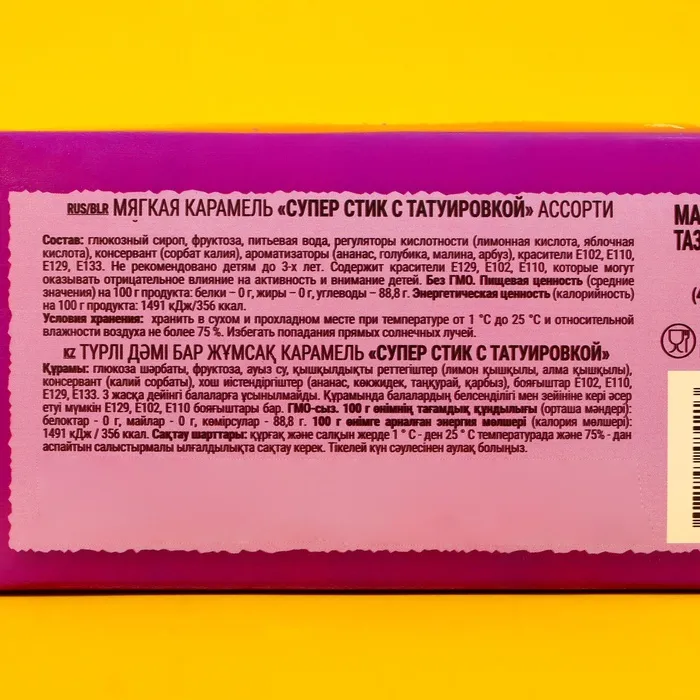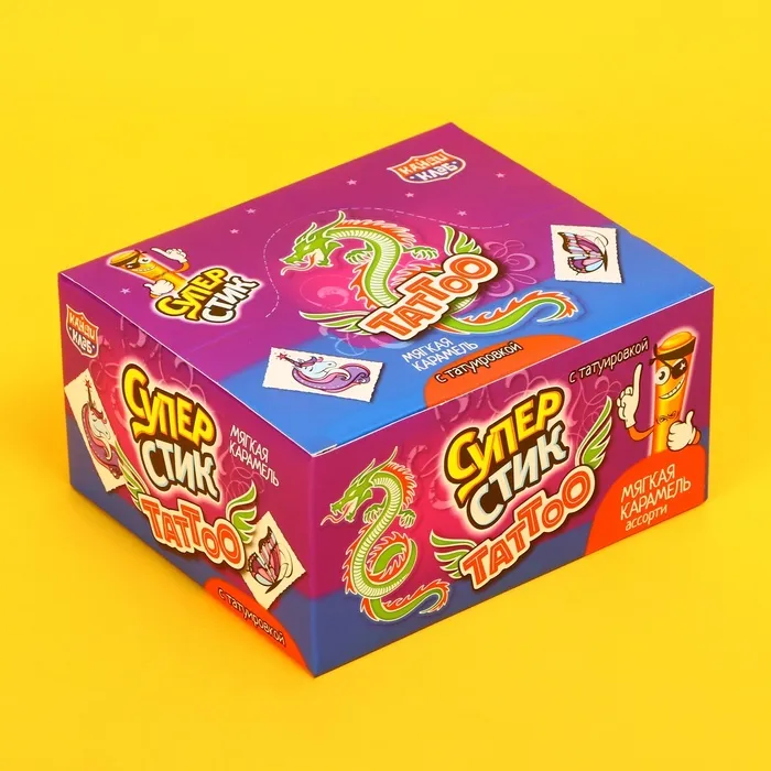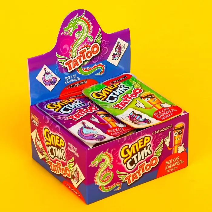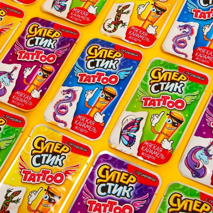 Карамель – классическое любимое всеми лакомство! В каждом пакетике Вы найдёте пластиковые трубочки-стики с мягкой фруктовой карамелью внутри и переводную татуировку с необычным узором.