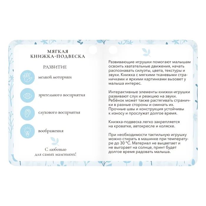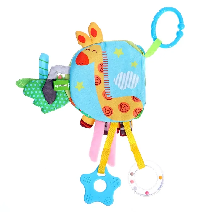 Малыш изучает текстуры и звуки, укрепляет ручки, экспериментируя с перелистыванием страниц и игрой с подвеской. Прорезыватель — это дополнительное преимущество, которое делает игрушку незаменимой в первые месяцы жизни.