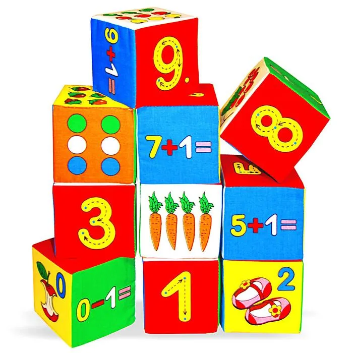 • Набор включает 10 мягких кубиков с буквами и картинками для изучения математики.
