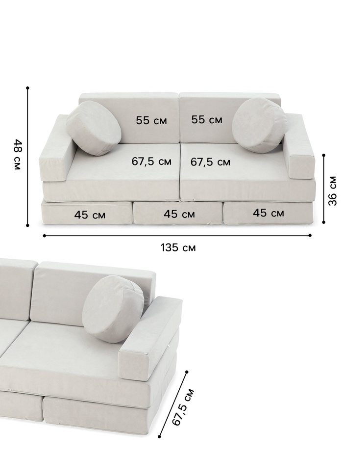 - 11 модулей — можно собирать множество форм: диван, кресло, лежанку, игровые конструкции.