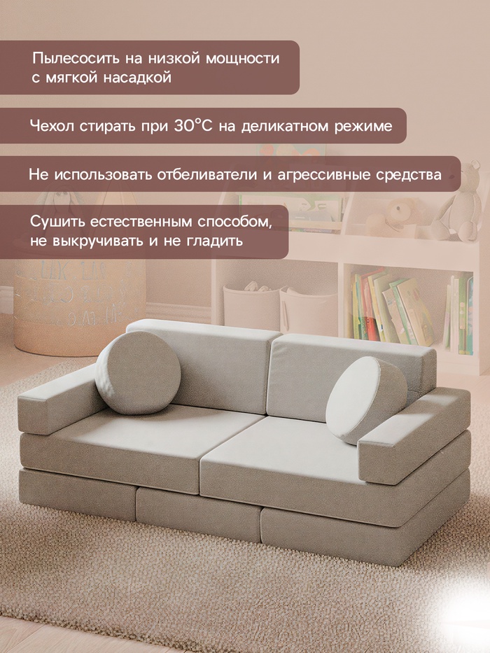 Флисовые чехлы дарят приятные тактильные ощущения — хочется присесть, облокотиться, устроиться поудобнее. Такой диван становится не просто мебелью, а частью ежедневных домашних ритуалов: тут и тихий отдых, и фантазийные постройки, и уютные вечера всей семьёй.