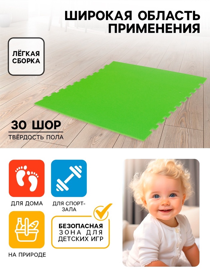 Мягкий пол «Зелёные соты» — это практичный и безопасный элемент для детской комнаты или игровой зоны. Его яркий дизайн и удобный размер делают его идеальным решением для создания комфортного пространства. Изготовленный из материала EVA, этот коврик сочетает в себе мягкость, прочность и экологичность.