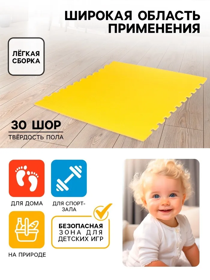 «Жёлтые соты» — это не просто покрытие, а способ сделать пространство безопасным и привлекательным. Мягкая поверхность защищает ребёнка от травм и холода, а яркий жёлтый цвет добавляет игривости в интерьер. Коврик легко моется и сохраняет свою форму даже после длительного использования. Это надёжное решение для родителей, которые ценят практичность и комфорт.