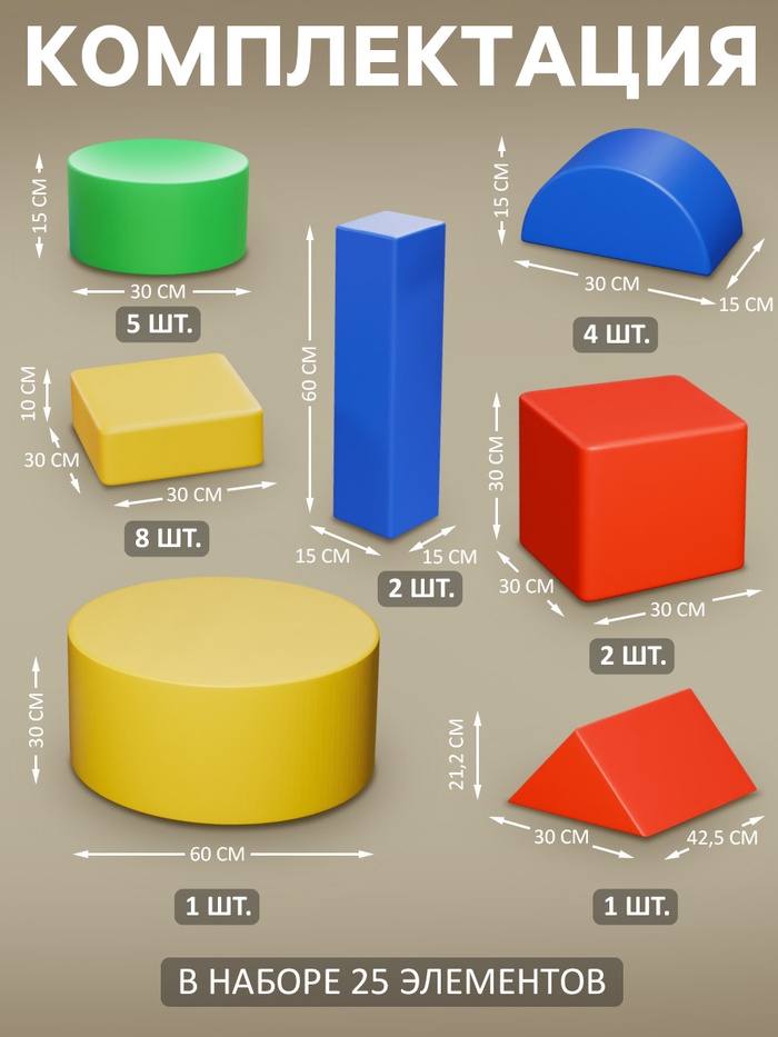 Элементы плотно набиты поролоном и обтянуты винилискожей, не содержат жёстких конструкций, что обеспечивает высокую надёжность и безопасность при эксплуатации. Материалы гипоаллергенны, износоустойчивы и просты в уходе. Для удаления загрязнений достаточно протереть влажной тряпкой.