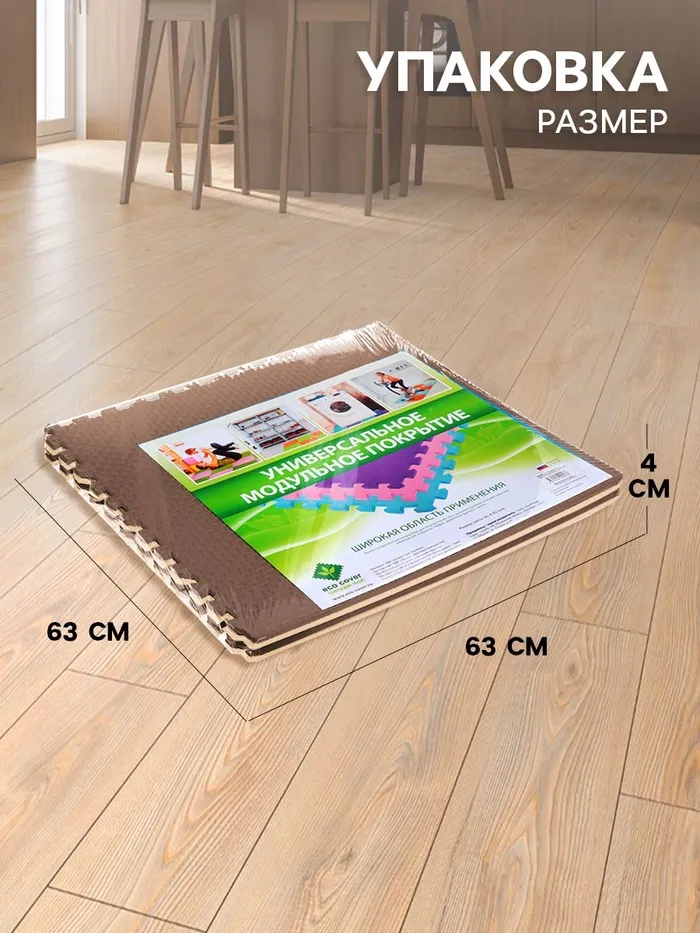 - Комплект состоит из 4 частей размером 60 × 60 см. Общая площадь коврика составляет 1,44 м2.