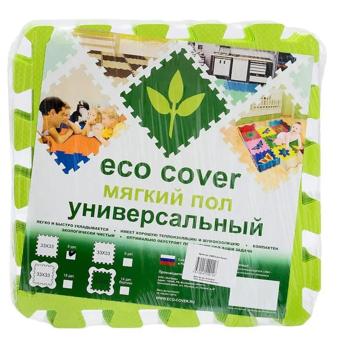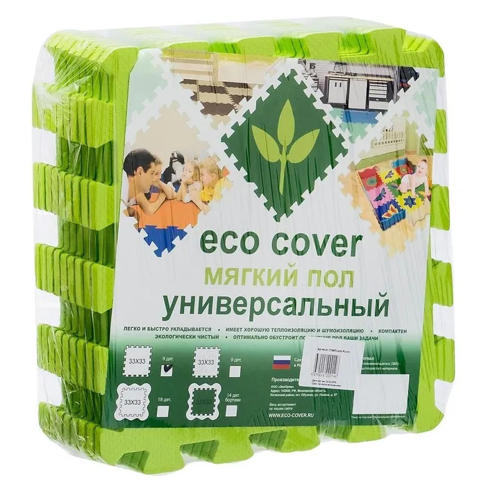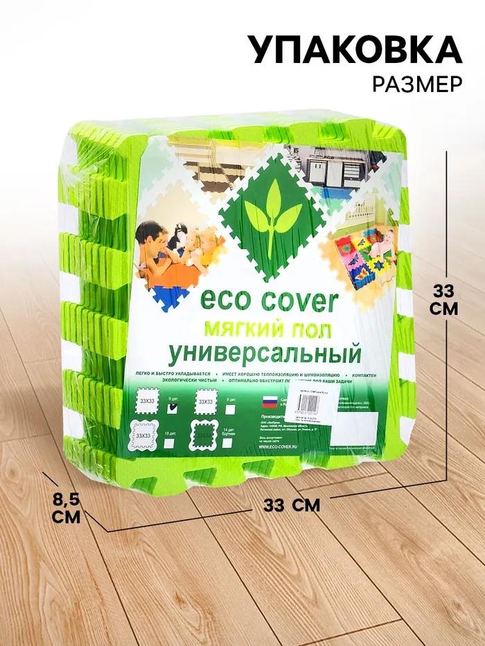 - Комплект состоит из 9 частей размером 33 × 33 см. Общая площадь коврика составляет 1 м2.