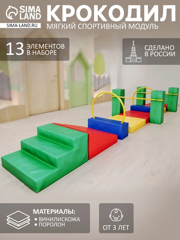 Мягкий спортивный модуль «Крокодил» — это развлечение, основанное на старинной восточной игре танграм. В этой игре из большой фигуры нужно сложить несколько разных, напоминающих привычные предметы. Спортивный модуль сделан из мягких и негнущихся материалов, совершенно безопасных для детей. Игра выполнена в виде полосы препятствий, поэтому проходить испытание будет весело и интересно.