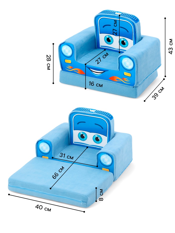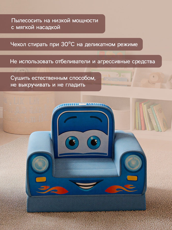 Мягкое кресло «Машинка синия» сразу превращает детскую комнату в маленький гараж приключений. Яркое лицо-машинка вызывает улыбку, а мягкое сиденье делает отдых по-настоящему уютным. Конструкция легко раскладывается — и кресло за секунду становится удобным лежаком для чтения, игр или тихого расслабления после насыщенного дня.