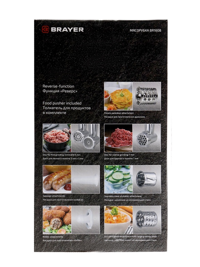Удобство использования подчеркивается наличием функции реверса, которая помогает легко справиться с застрявшим мясом, а также отсеком для хранения насадок. Четыре насадки и три диска позволяют экспериментировать с различными рецептами, будь то котлеты, тефтели или начинка для чебуреков. Прорезиненные ножки обеспечивают устойчивость на любой поверхности, делая процесс приготовления максимально комфортным.