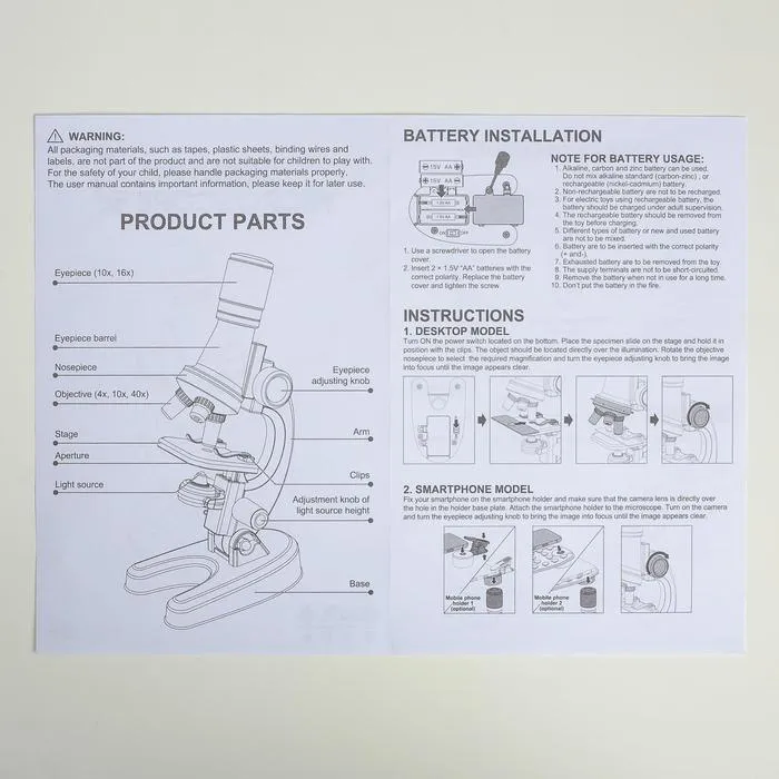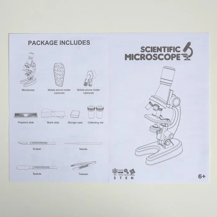 - Высокая кратность увеличения: Этот микроскоп позволяет производить исследования на увеличении от 100 до 1200х. Это невероятное разнообразие увеличений способствует обучению детей, развивая их любознательность и внимание к деталям.