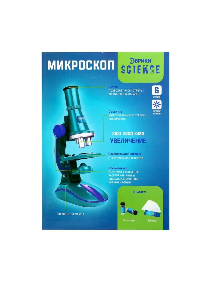 С помощью микроскопа малыш проведёт множество уникальных опытов и наблюдений. Качественный окуляр позволяет увеличить объект в 100, 200 и 450 раз, а специальное колёсико фокусировки настраивает необходимую резкость.