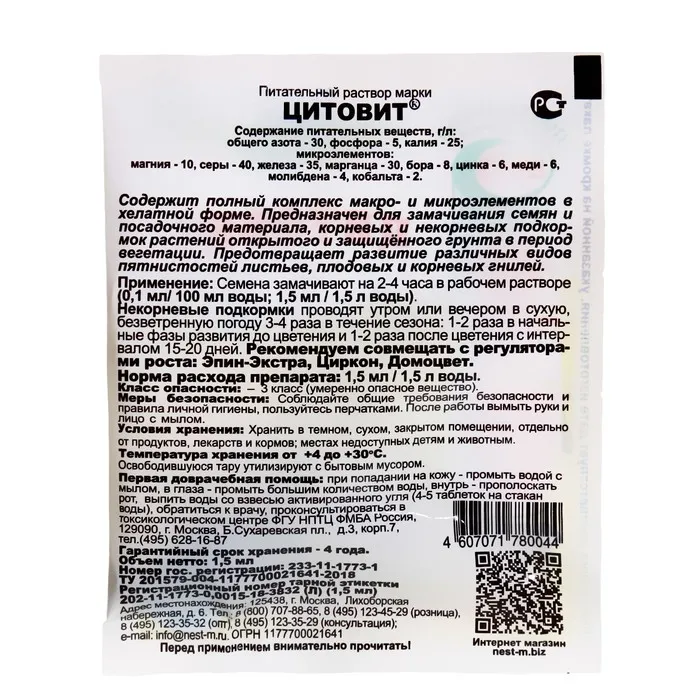 Микроудобрение, с макро и микро элементами ЦИТОВИТ 1,5 мл — Характеристики