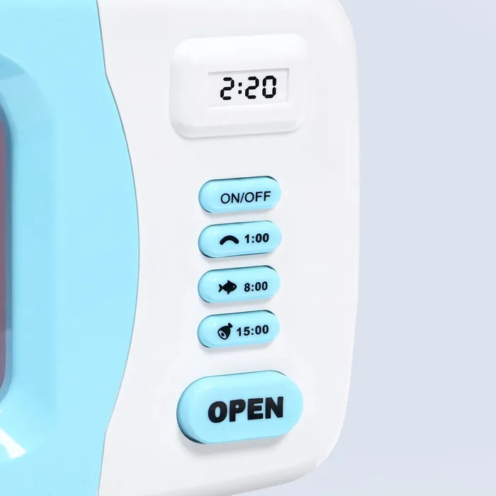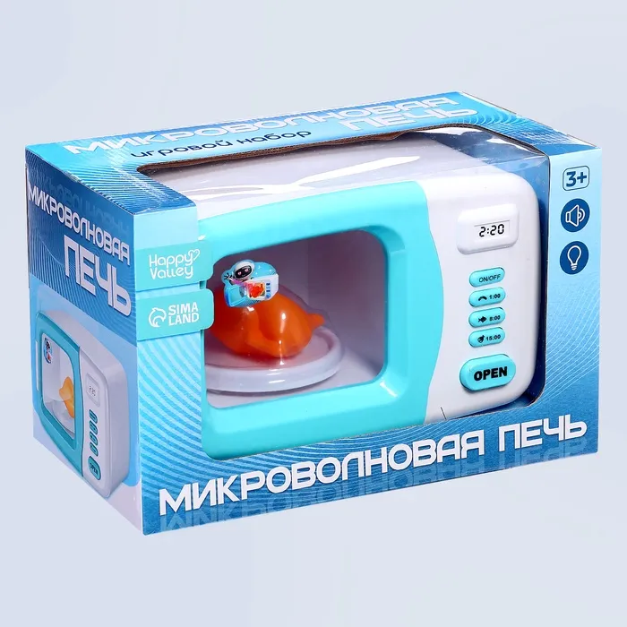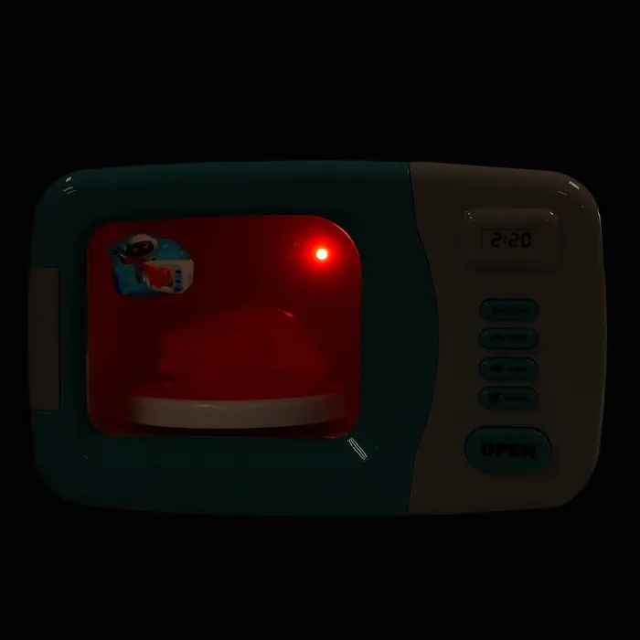 Устройство выглядит как настоящее: чтобы открыть дверцу, достаточно нажать на кнопку, а когда она закроется, тарелка внутри начнёт вращаться. Клавиши светятся и информируют о нескольких режимах приготовления. Девочка выберет способ и включит прибор. Как только блюдо будет готово, раздастся характерный звук — можно накрывать на стол.