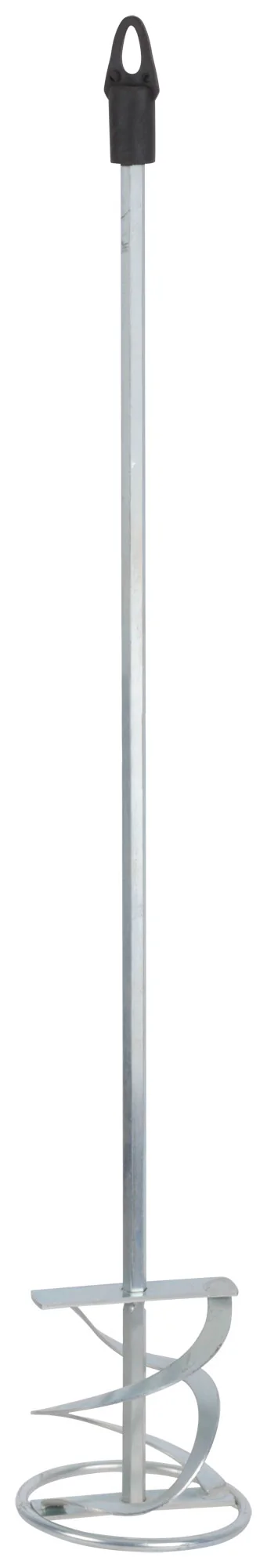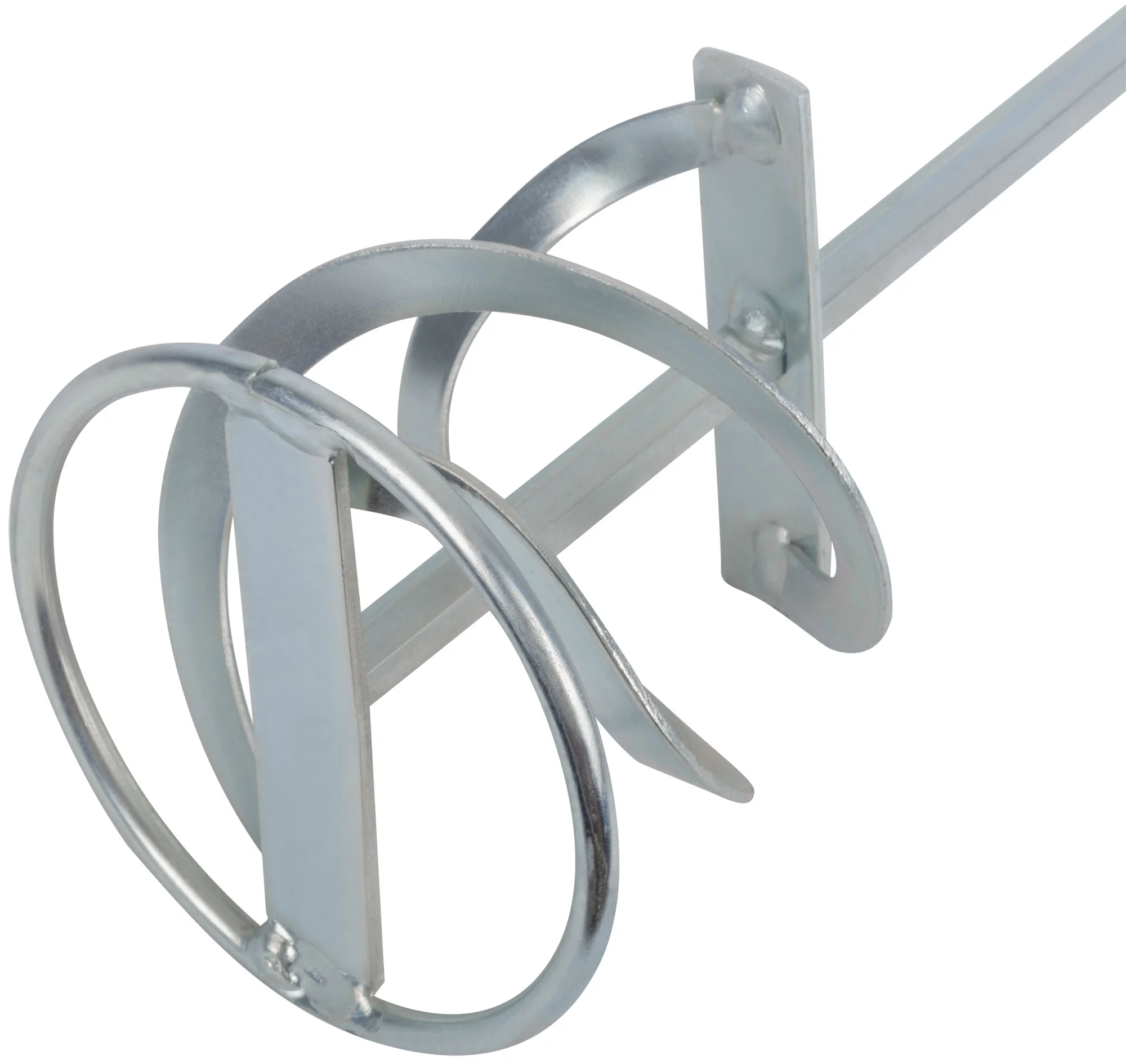 Миксер выполнен из прочного оцинкованного металла, что обеспечивает его долговечность и устойчивость к коррозии. Шестигранное сечение стержня позволяет надежно закрепить насадку в дрели, предотвращая её проскальзывание во время работы.