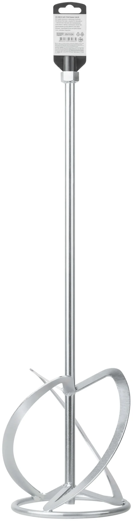 Конструкция миксера включает усиленную насадку из инструментальной стали с цинковым покрытием, что обеспечивает долговечность и надежность при интенсивной эксплуатации. Хвостовик с резьбой М14 позволяет легко закрепить миксер на большинстве стандартных электродрелей.