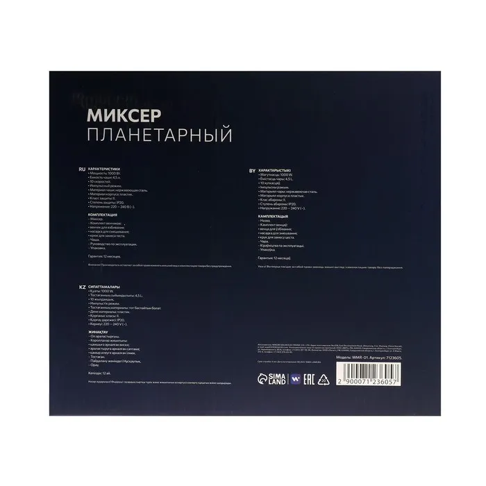Миксер Windigo WMR-01, планетарный, 1000 Вт, 4.5 л, 8 скоростей, 3 насадки, чёрный — Характеристики