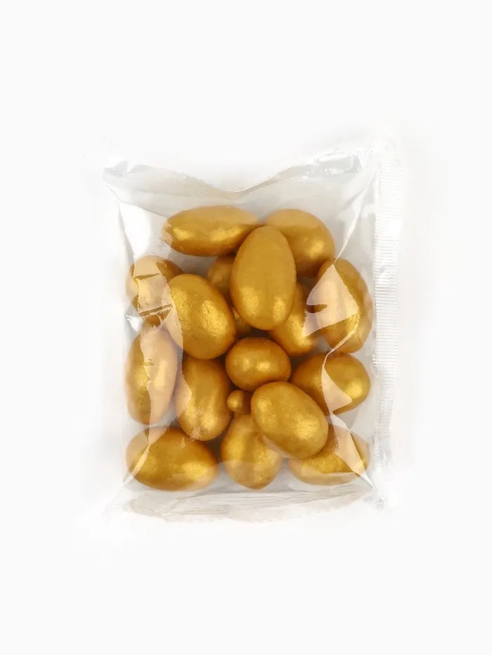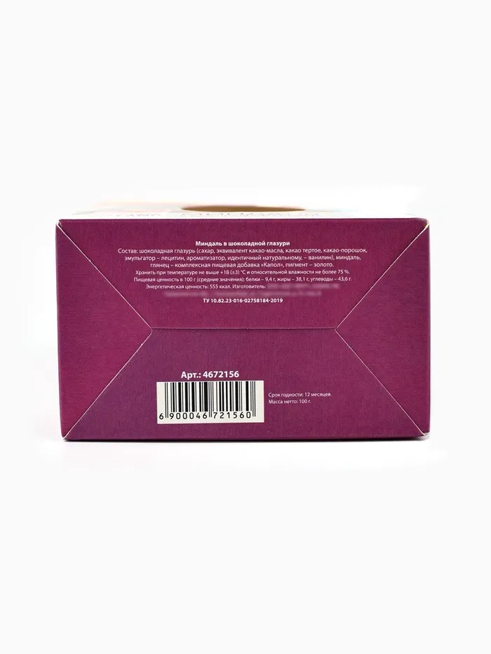 Состав: шоколадная глазурь (сахар, эквивалент какао-масла, какао тертое, какао-порошок, эмульгатор – лецитин, ароматизатор, идентичный натуральному, – ванилин), миндаль, глянец – комплексная пищевая добавка «Капол», пигмент – золото.