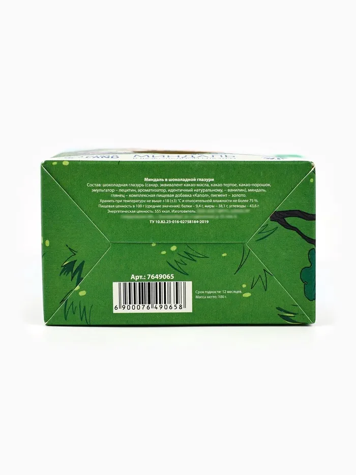 Состав: шоколадная глазурь (сахар, эквивалент какао-масла, какао тертое, какао-порошок, эмульгатор - лецитин, ароматизатор, идентичный натуральному - ванилин), миндаль, глянец - комплексная пищевая добавка "Капол", пигмент - золото.
