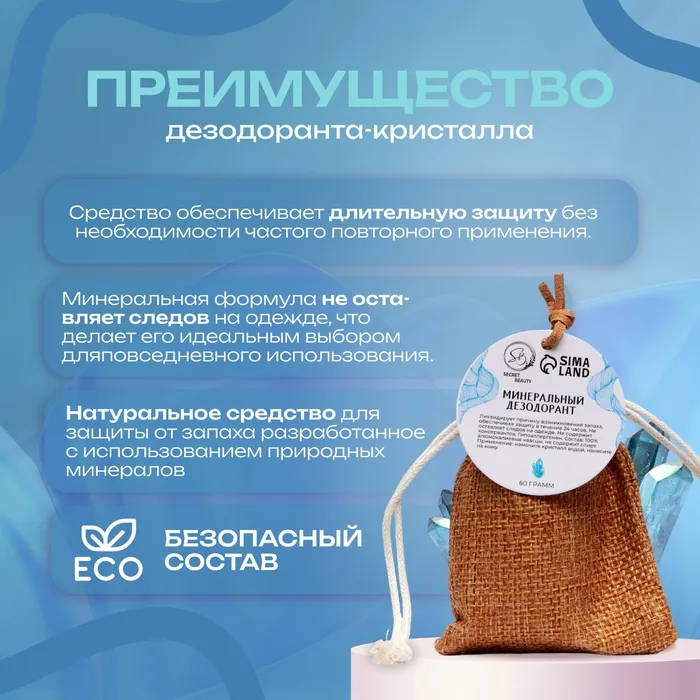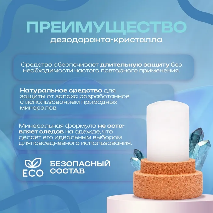 Минеральный дезодорант. Представляет собой натуральный кристалл алунит, обладающий высокой антибактериальной активностью. Предотвращает появление пота и неприятного запаха в течение всего дня. Заживляет ранки и увлажняет.