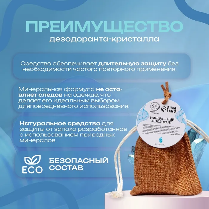 Минеральный дезодорант «Алоэ Вера». Представляет собой натуральный кристалл алунит, обладающий высокой антибактериальной активностью. Предотвращает появление пота и неприятного запаха в течение всего дня. Заживляет ранки и увлажняет.