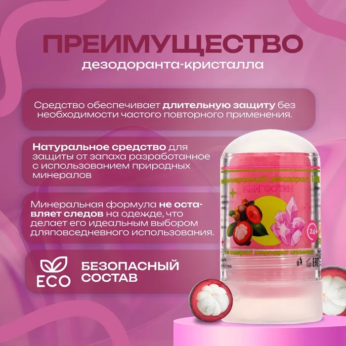 Минеральный дезодорант «Мангустин». Представляет собой натуральный кристалл алунит, обладающий высокой антибактериальной активностью. Предотвращает появление пота и неприятного запаха в течение всего дня. Заживляет ранки и увлажняет.