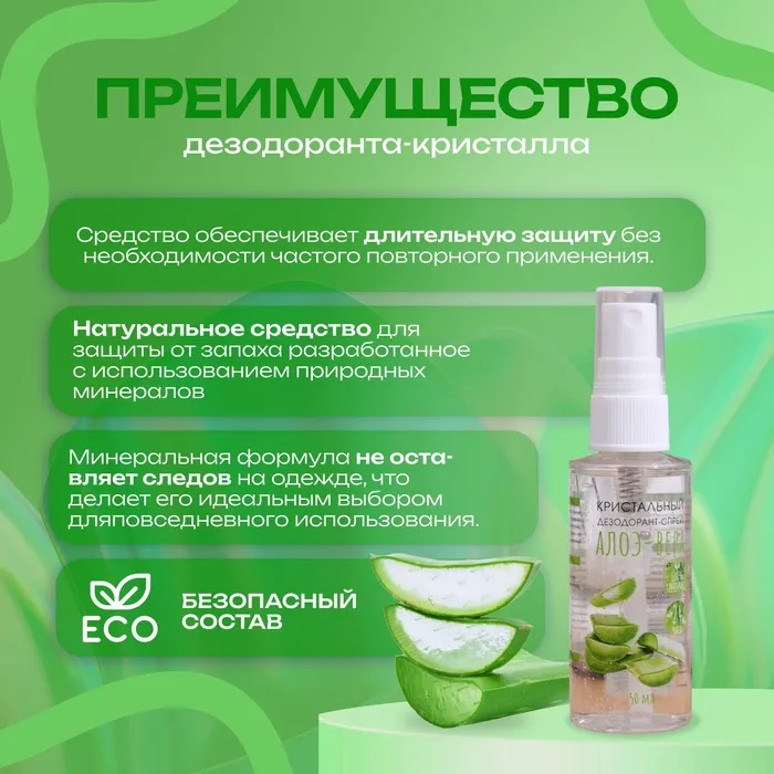Натуральный минеральный дезодорант поможет сохранить эффект свежести на протяжении всего дня. Активные компоненты нейтрализуют неприятный запах, экстракт алоэ вера обладает бактерицидным и противовоспалительным свойствами. Спрей можно использовать как для тела, так и для ног. Эффективен при занятиях спортом.