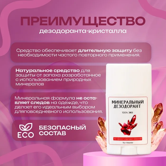 Минеральный дезодорант в стике. Представляет собой натуральный кристалл алунит, обладающий высокой антибактериальной активностью. Предотвращает появление пота и неприятного запаха в течение всего дня. Заживляет ранки и увлажняет. Форма стика приятна именно тем, что можно использовать именно столько поверхности кристала, сколько нужно. Стик имеет механизм поднятия и опуска кристалла.