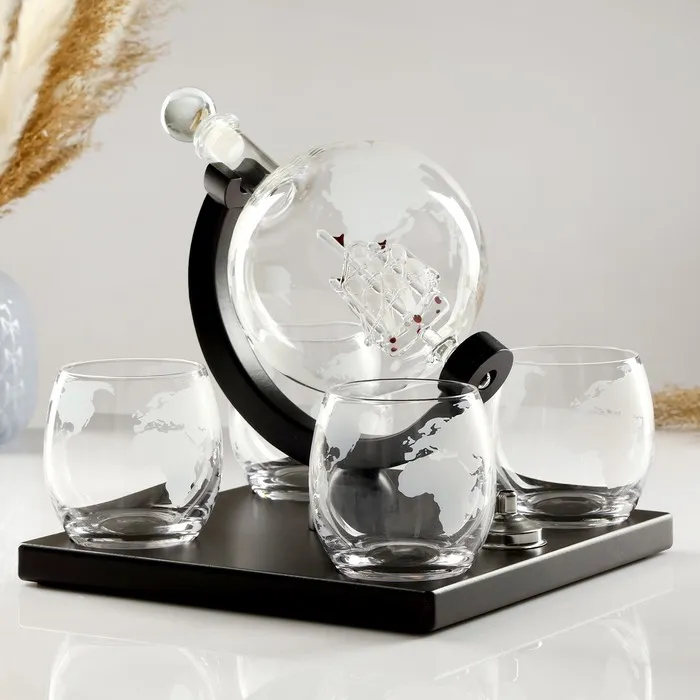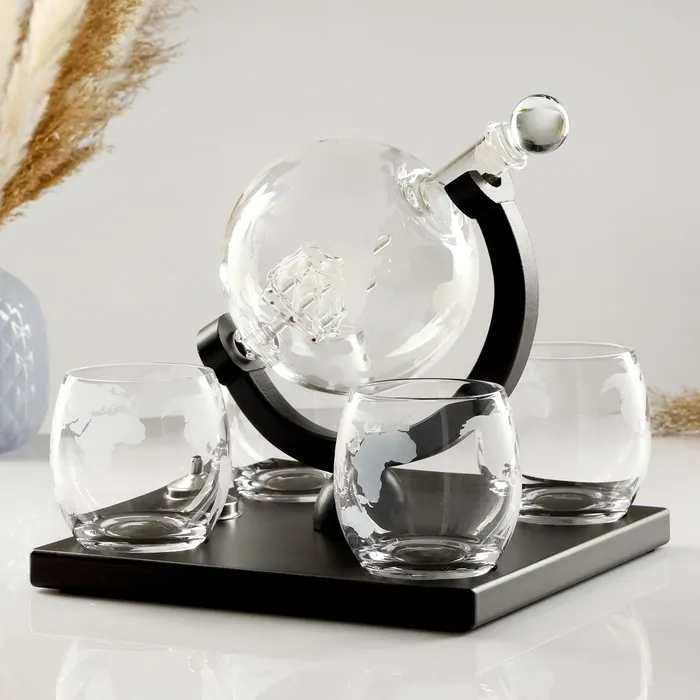 - Дизайн, вдохновленный путешествиями: Штоф в виде глобуса и бокалы с картами мира – это настоящее произведение искусства.