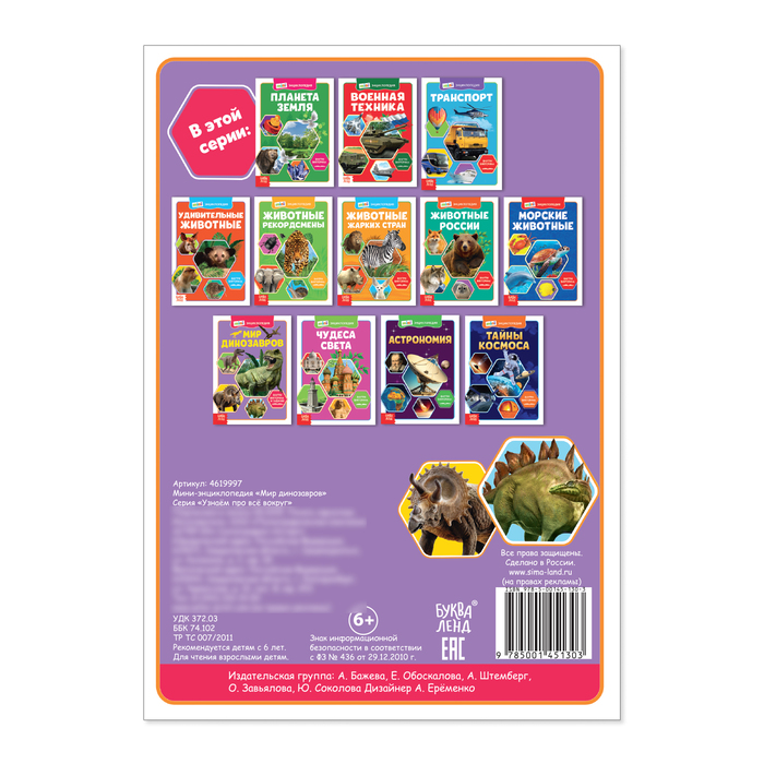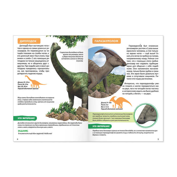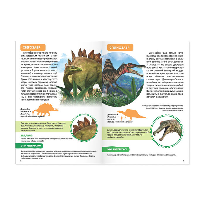 Мини-энциклопедия «Мир динозавров» — лучший подарок для маленького археолога. Она познакомит ребёнка с доисторическими ящерами: стегозавром, спинозавром, диплодоком, паразауролофом и многими другими. Малыш узнает об их особенностях, образе жизни и удивит этими фактами друзей.