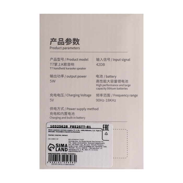 Мини караоке-система T7, 5 Вт, микрофон, 1800/800мАч, Jack 3.5, Type-С, RGB, бежевая — Характеристики