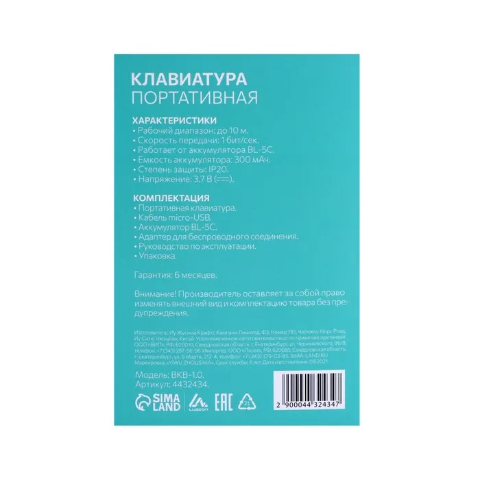 Мини-клавиатура Luazon BKB-1.0, беспроводная для ТВ, ПК и моб. уст-в, черная — Характеристики