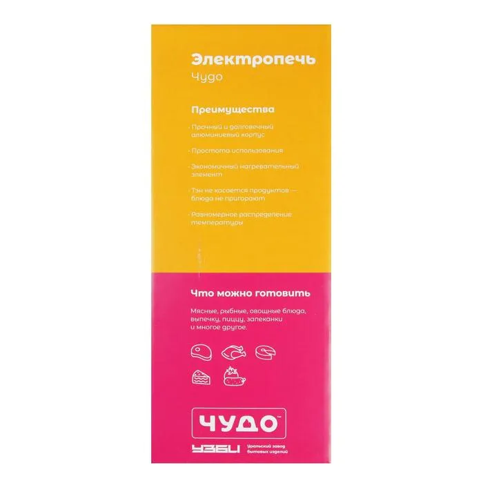 Электропечь бытовая «Чудо» приготовит вкусные закуски, вторые блюда и десерты. Запечённые в соусе рыбные канапе? Мясо по-французски? Пироги с капустой? Всё это Вы можете приготовить в электропечи. Прибор расходует в 2-3 раза меньше энергии, чем другие похожие модели. Вы экономите и готовите вкусную и здоровую пищу.