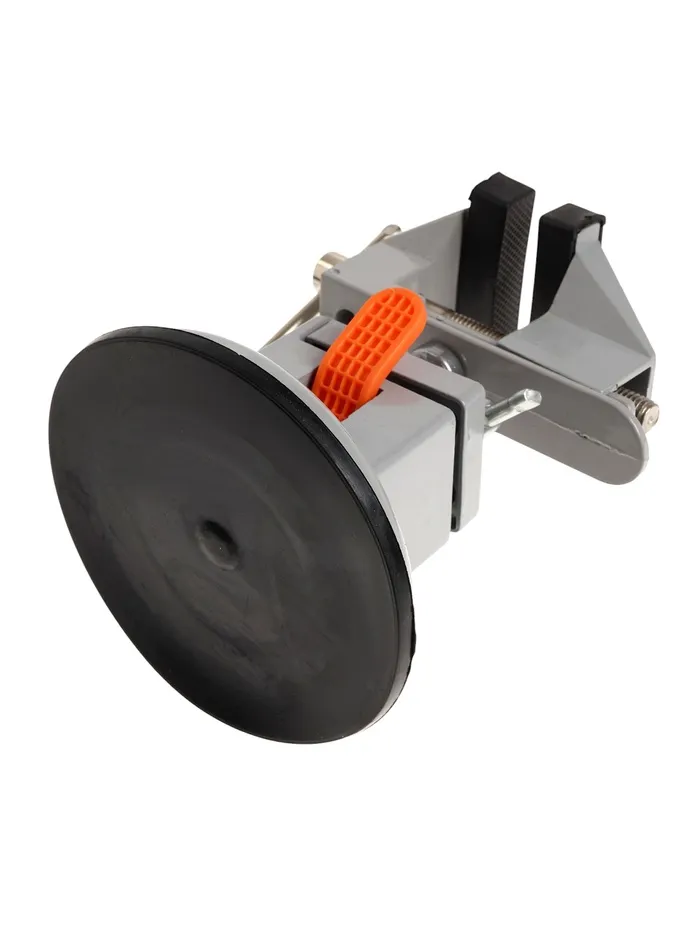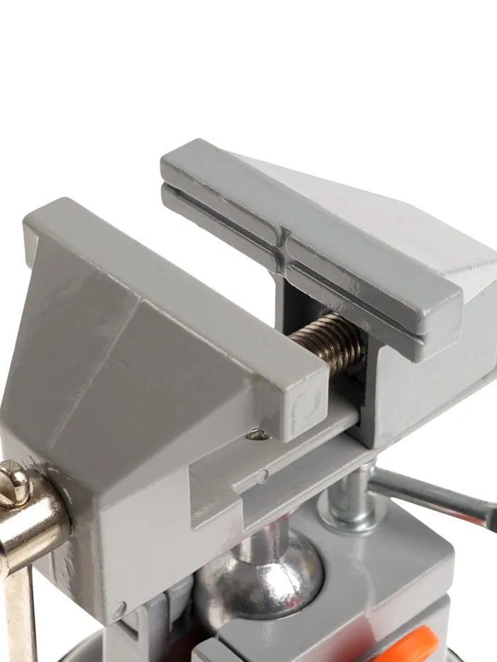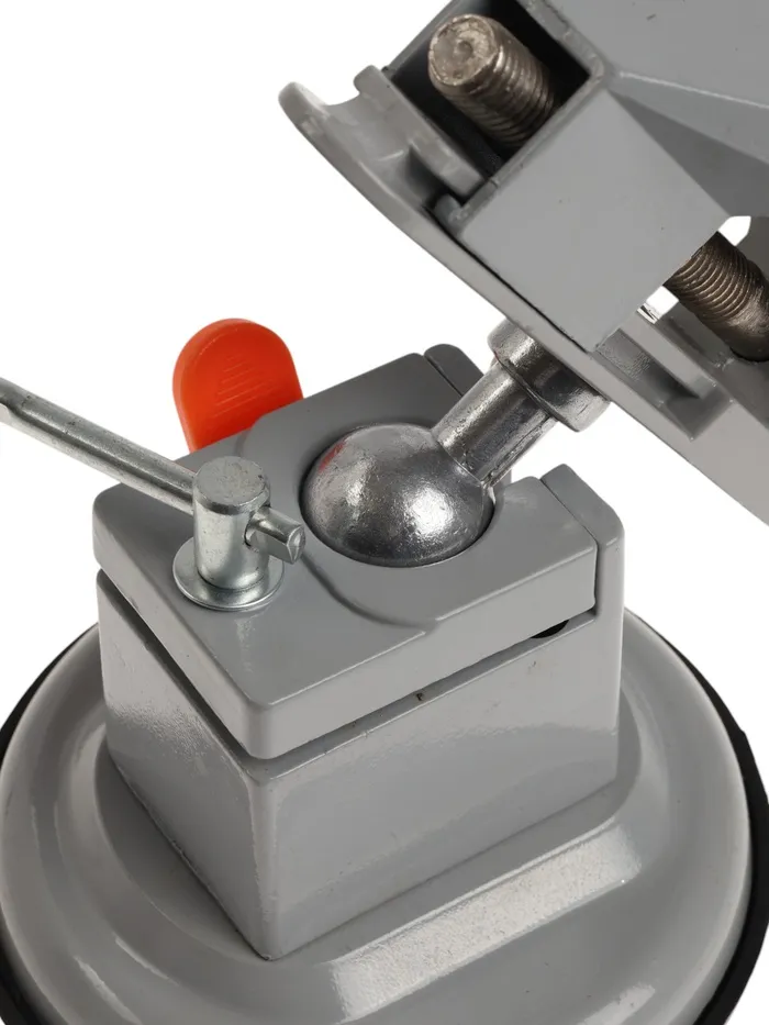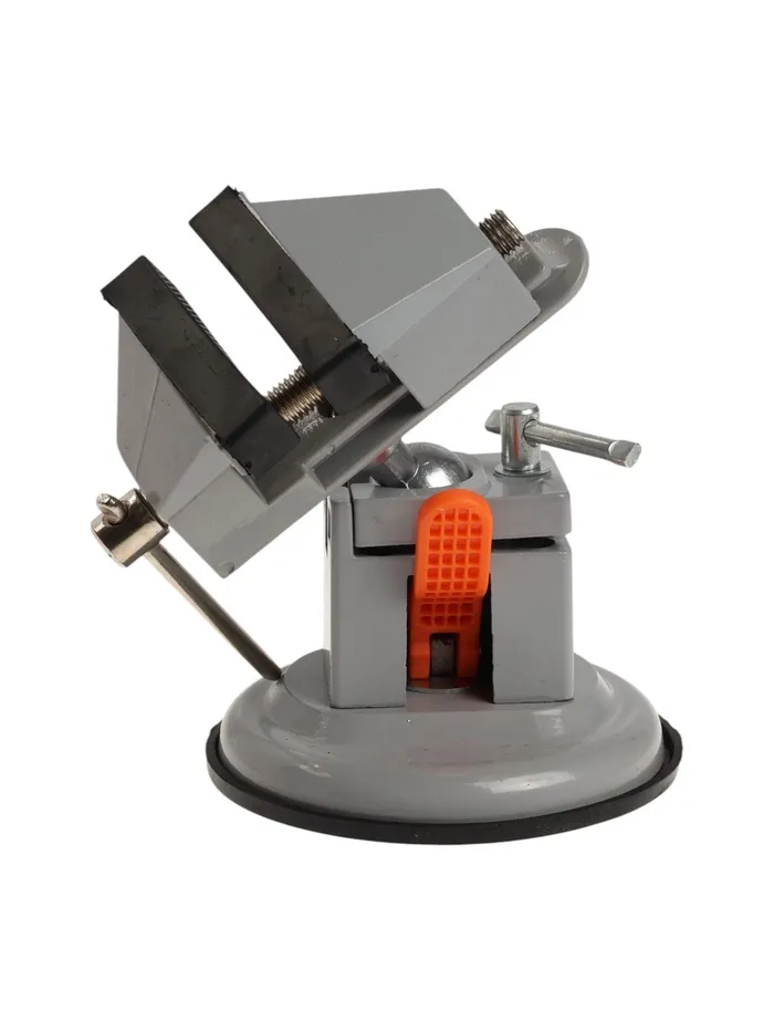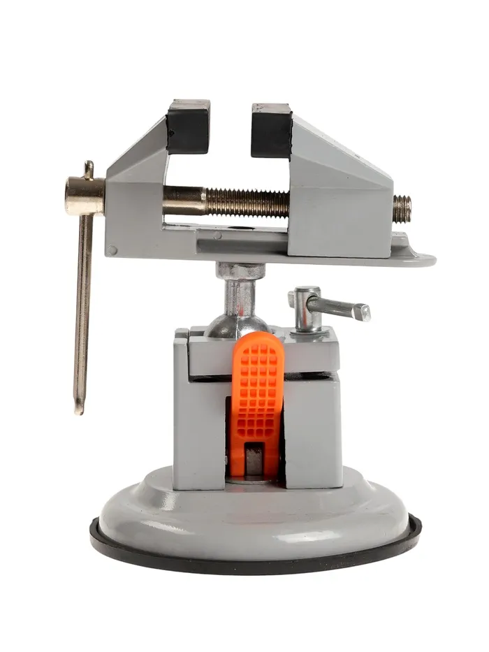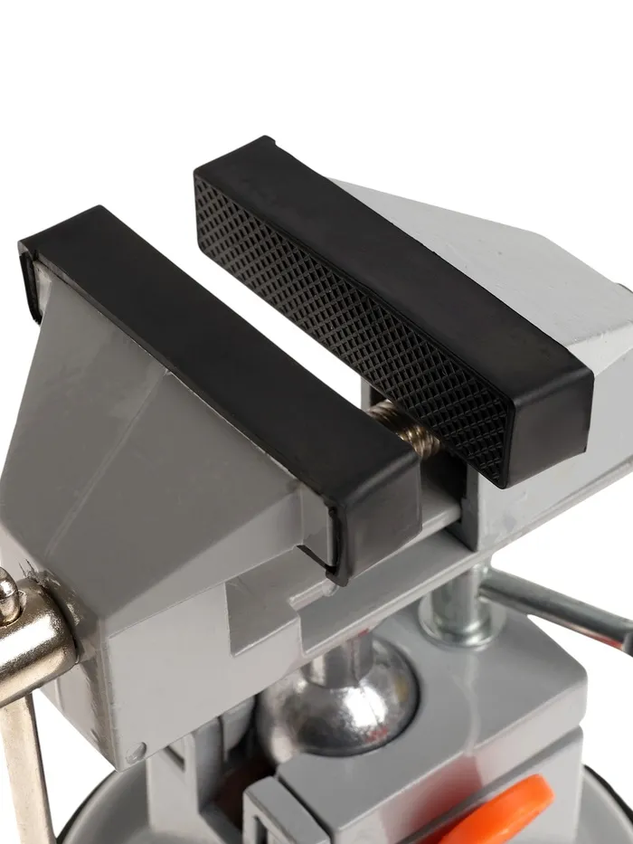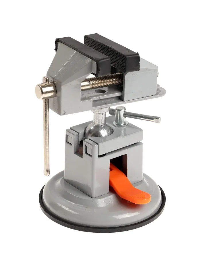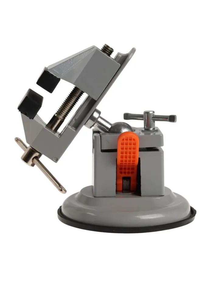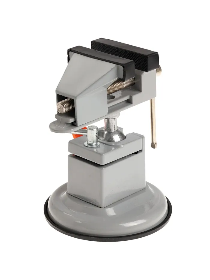 Модель изготовлена из алюминиевого сплава. Тиски оснащены резиновой вакуумной присоской в нижней базовой части, позволяющей крепить тиски к любым ровным поверхностям, а также шарнирным механизмом, что позволяет вращать и фиксировать рабочую верхнюю часть инструмента под нужным углом.