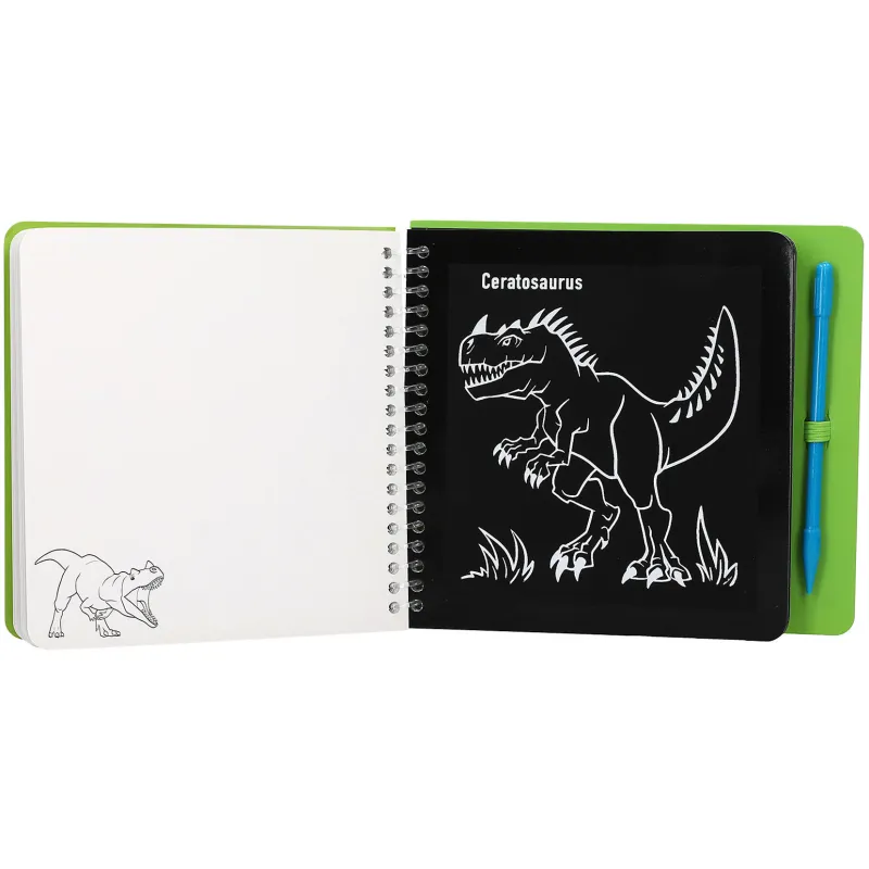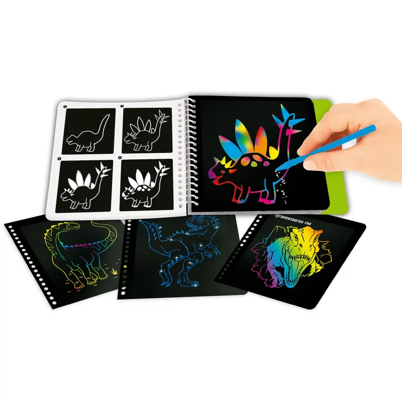 Создайте захватывающие произведения искусства, процарапывая свои рисунки на страницах мини-скетчбука Dino World! В книге 20 страниц, на которых вы сможете создавать потрясающие эффекты и красочные узоры. В комплекте с веселым скетчбуком идет скретч-ручка.