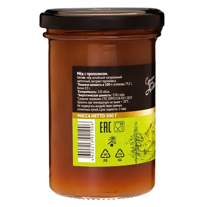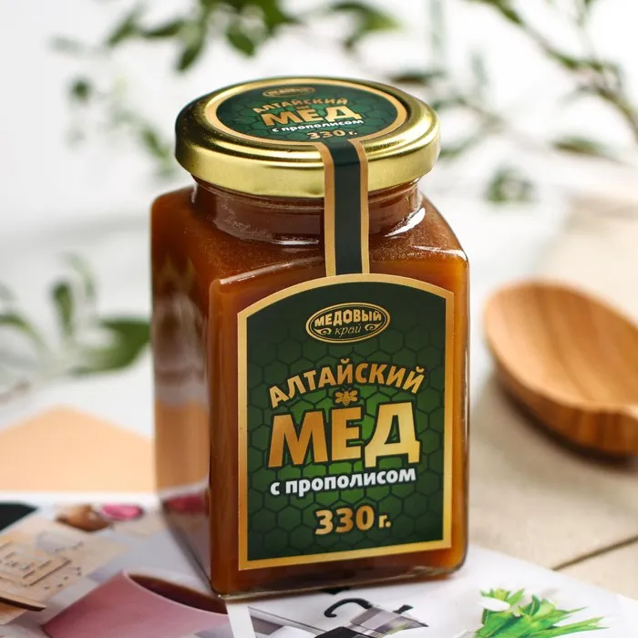 Состав: мёд алтайский натуральный цветочный, экстракт прополиса.