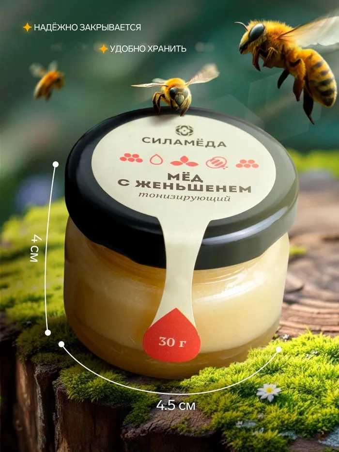 Тонизирующие и восстанавливающие свойства корня женьшеня значительно возрастают, когда он встречается с медом. А яркий аромат лекарственного растения выгодно дополняет нежную сладость.