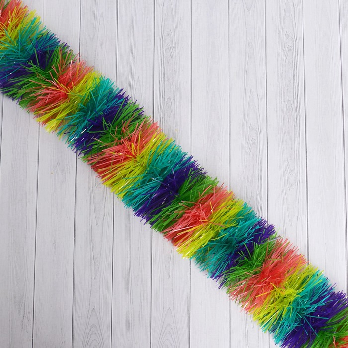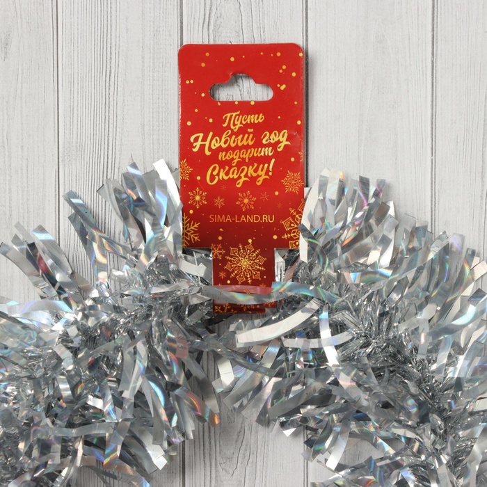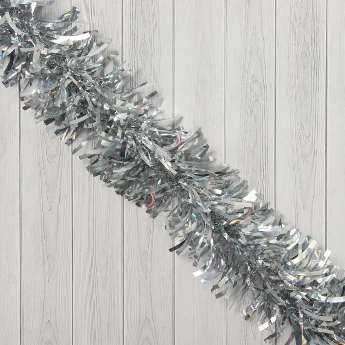 Серебристая мишура длиной 2 метра и диаметром 9 см сочетает в себе классическую эстетику и элементы шебби-шика. Такое украшение придаёт новогоднему декору лёгкость и изящество, создавая эффект нежного мерцания.