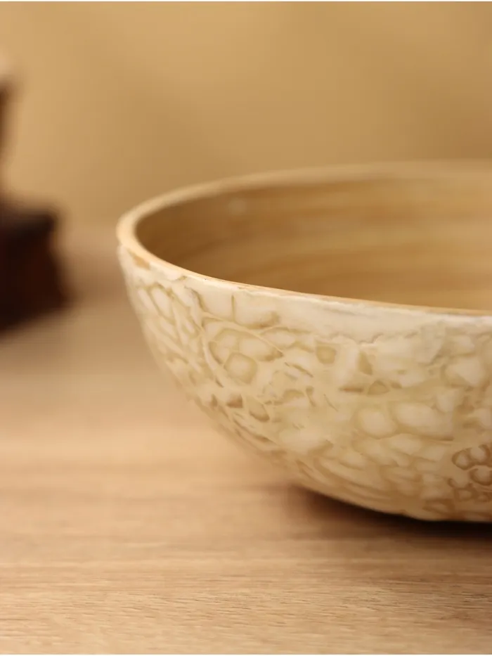 Миска из бамбука с изящными узорами. Идеально подойдет для сервировки стола и станет стильным акцентом на вашей кухне. Округлая форма и бежевый цвет дополнят любой интерьер. Её гладкая текстура и отсутствие крышки делают продукт легким в уходе. Подходит для горячих блюд, но не предназначена для СВЧ-печей и посудомоечной машины. Сделанная вручную, миска подчеркивает индивидуальность и уникальность. Диаметр 15 см - оптимальный размер для широкого спектра блюд.