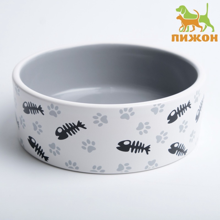 Миска для кошек керамическая Пижон «Рыбные косточки и лапки» 300 мл, 12.5×4.5 см, серая — Характеристики