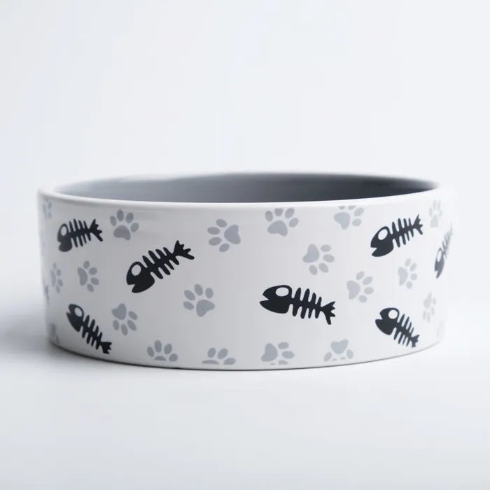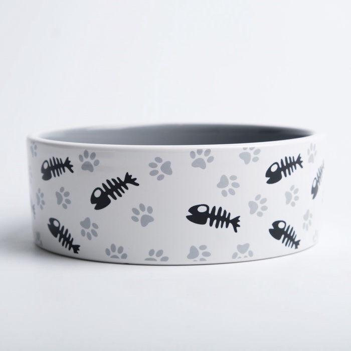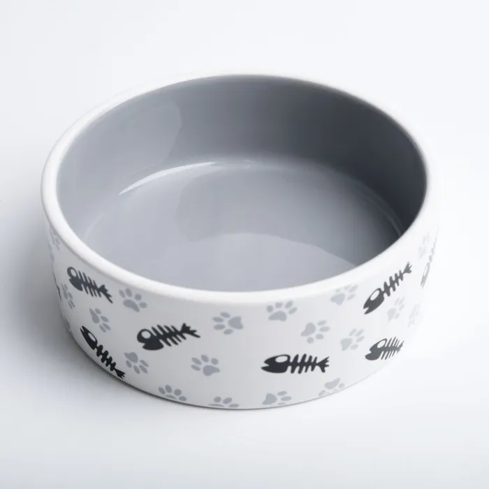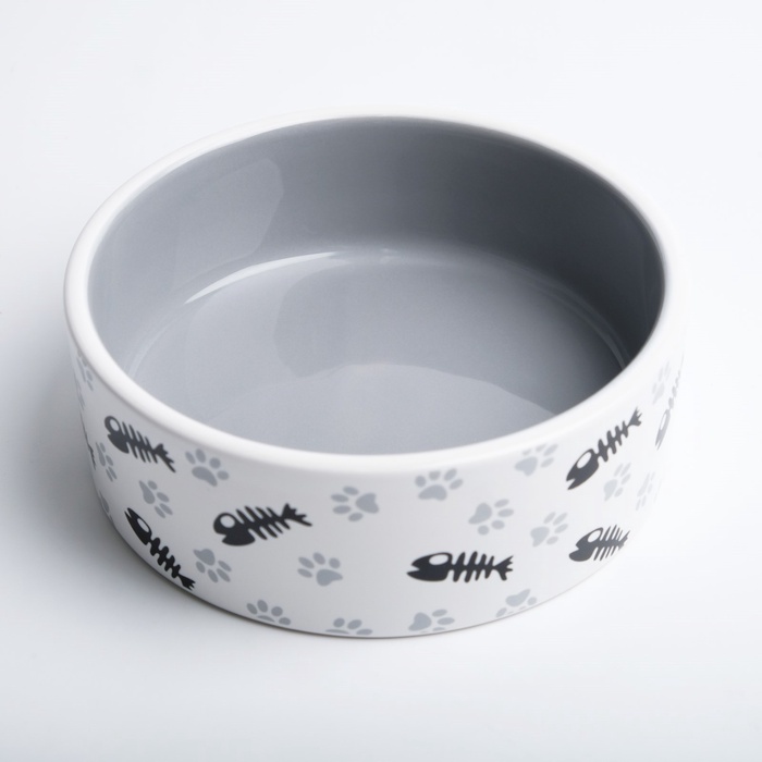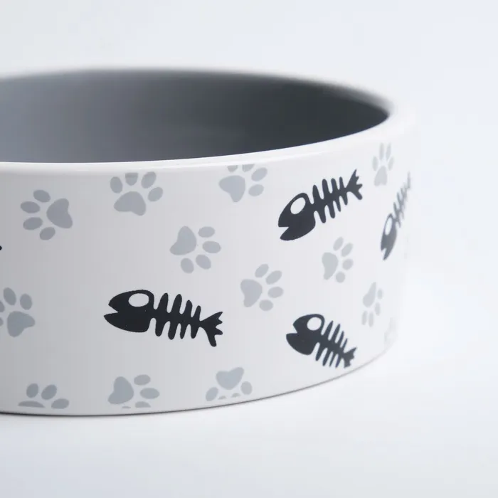 Миска для кошек керамическая Пижон «Рыбные косточки и лапки» 300 мл, 12.5×4.5 см, серая