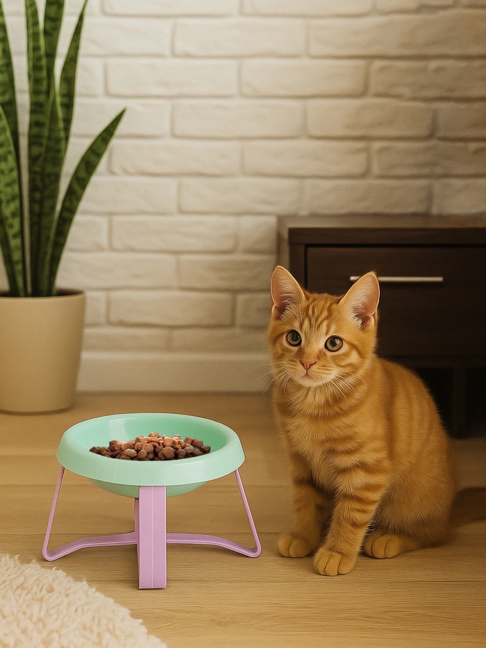 • Эргономика для кошек: Подставка приподнимает чашу на несколько сантиметров — шее не нужно выгибаться вниз. Это снижает нагрузку на позвоночник, особенно у пожилых или миниатюрных кошек.