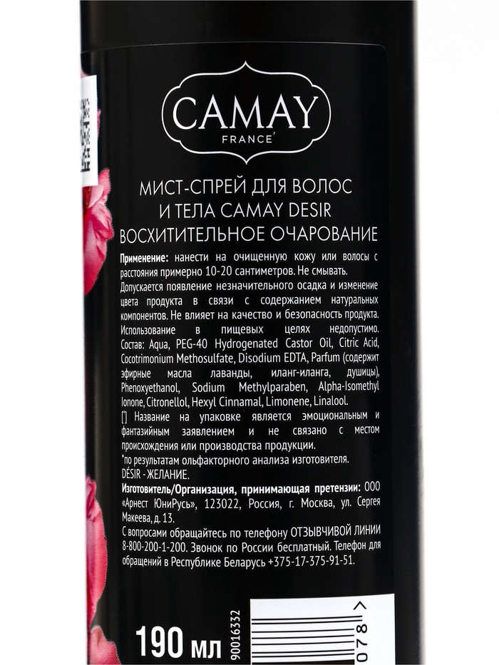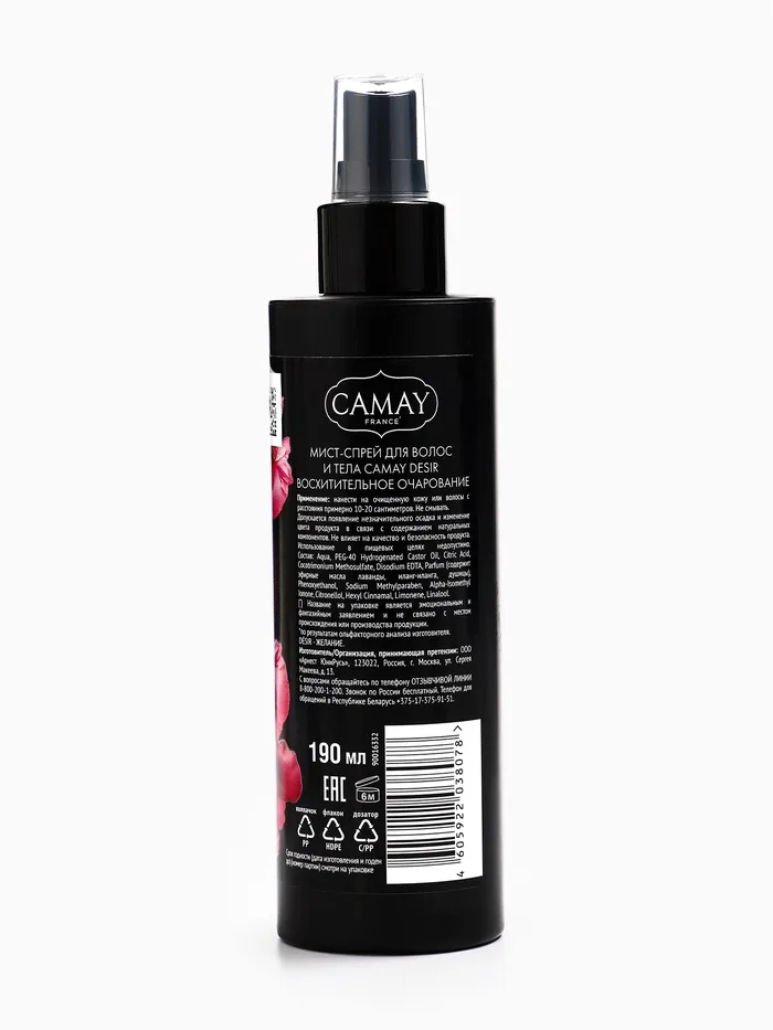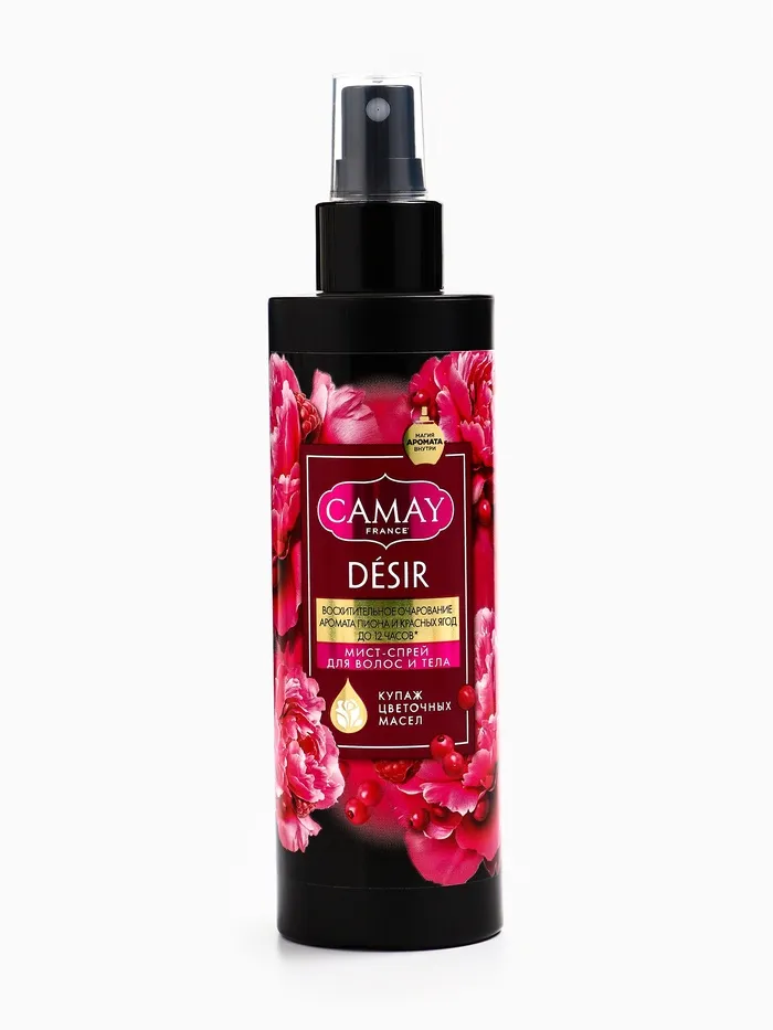 Парфюмированный мист CAMAY DESIR — это лёгкий ароматический спрей, который освежает кожу и волосы, даря им тонкий шлейф чувственного аромата. Яркое сочетание нот пиона и красных ягод создаёт нежный, игривый и одновременно женственный образ, подчёркивая вашу индивидуальность.