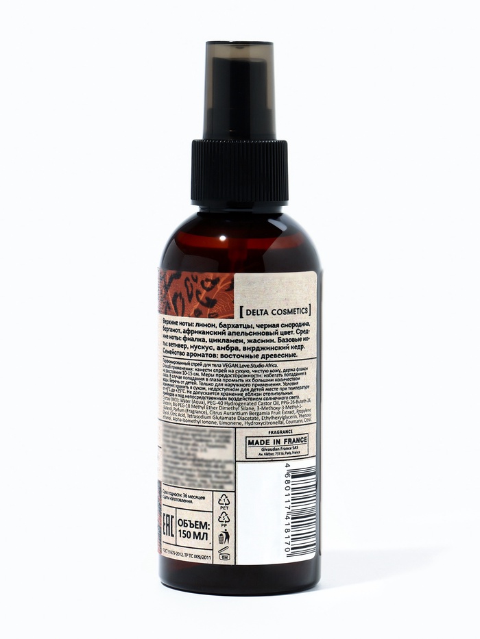 VEGAN.Love.Studio Africa — это мист для тела, который переносит в мир тепла, загадочности и утончённой роскоши. Он создан для женщин, которые ценят свободу, индивидуальность и элегантность. Лёгкая текстура спрея мягко окутывает кожу ароматом, оставляя шлейф чувственности и уверенности.