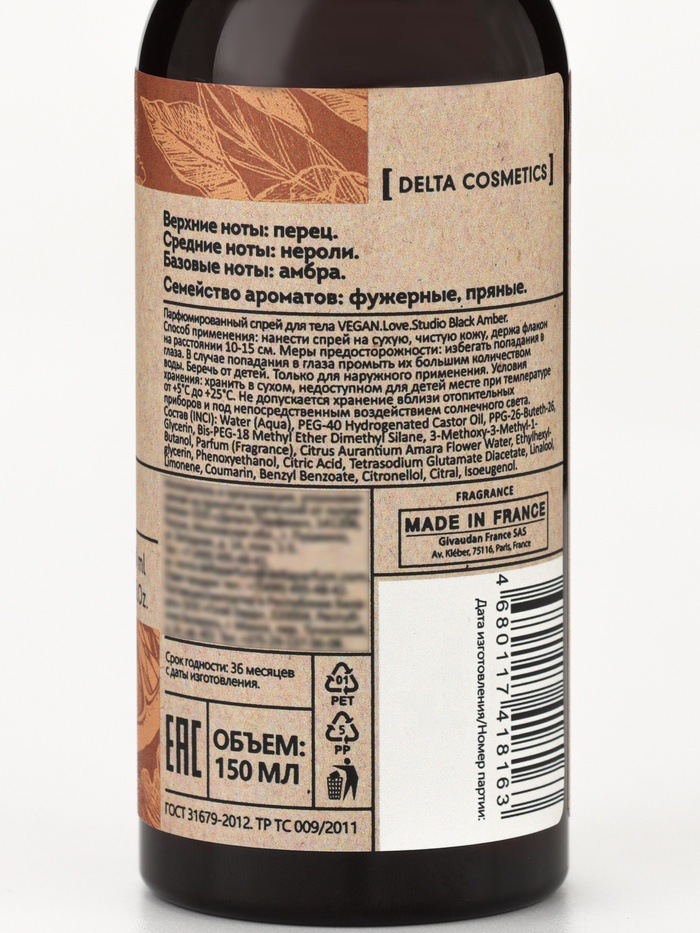 Мист парфюмированный спрей для тела VEGAN.Love.Studio Black Amber, 150 мл (по мотивам Black Pepper & Amber, Neroli (Zielinski & Rozen) — Характеристики