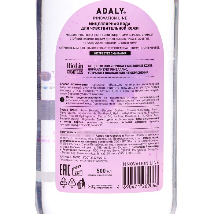 Способ применения: нанесите небольшое количество мицеллярной воды на ватный диск и бережно очистите кожу лица и губ. Для снятия макияжа с глаз приложите ватный диск к веку на несколько секунд, затем бережно удалите макияж.