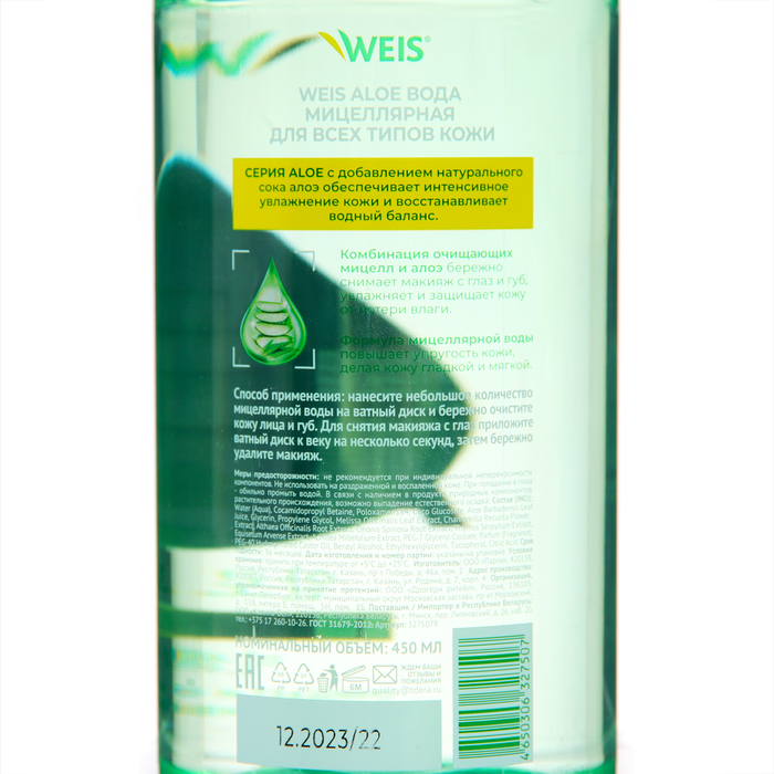 Мицеллярная вода для лица Weis Aloe – это мягкое и эффективное очищающее средство, которое идеально подходит для удаления макияжа и загрязнений с чувствительной кожи лица.