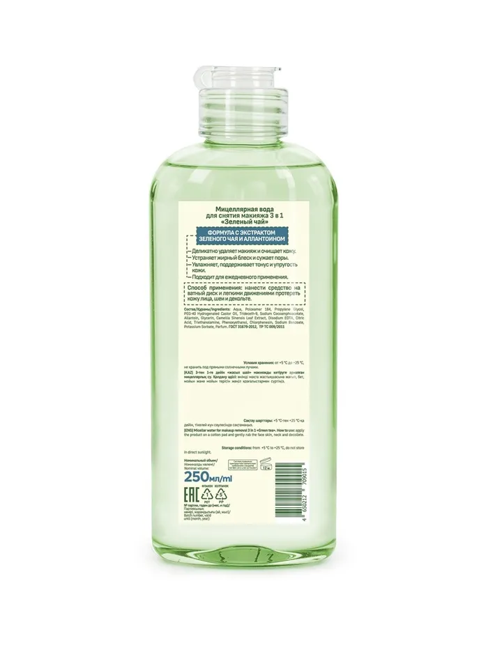 Мицеллярная вода 3 в 1 с бодрящим тонким ароматом зелёного чая эффективно очищает и освежает кожу, удаляет макияж, загрязнения, устраняет жирный блеск.