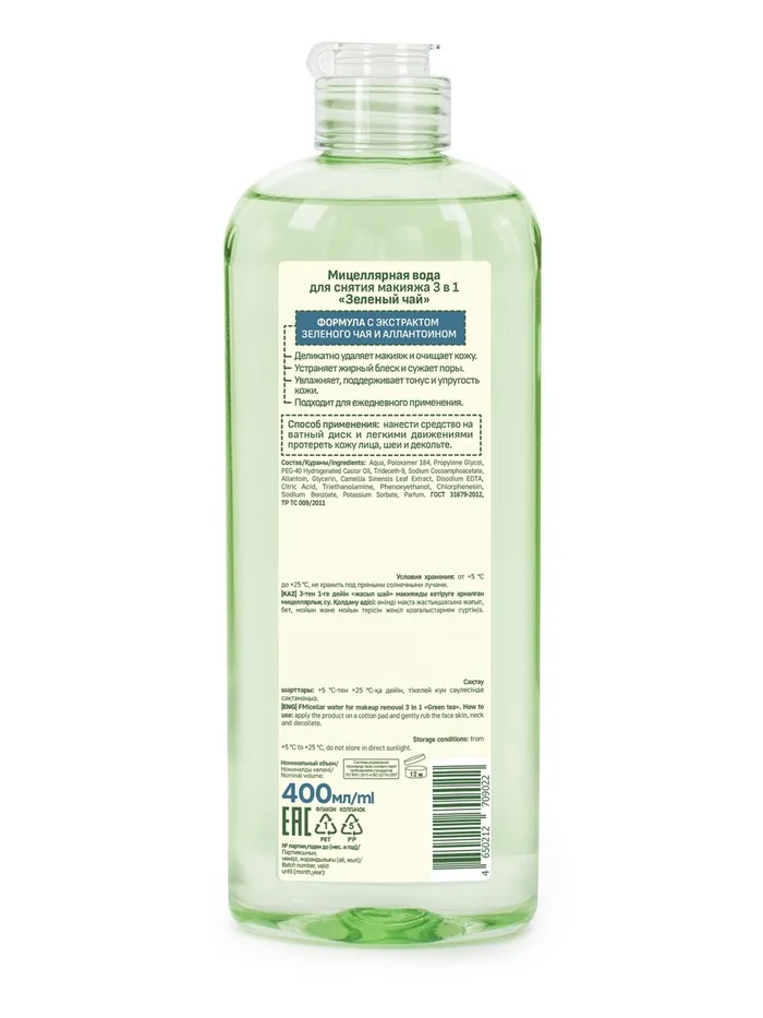 Мицеллярная вода 3 в 1 с бодрящим тонким ароматом зелёного чая эффективно очищает и освежает кожу, удаляет макияж, загрязнения, устраняет жирный блеск.