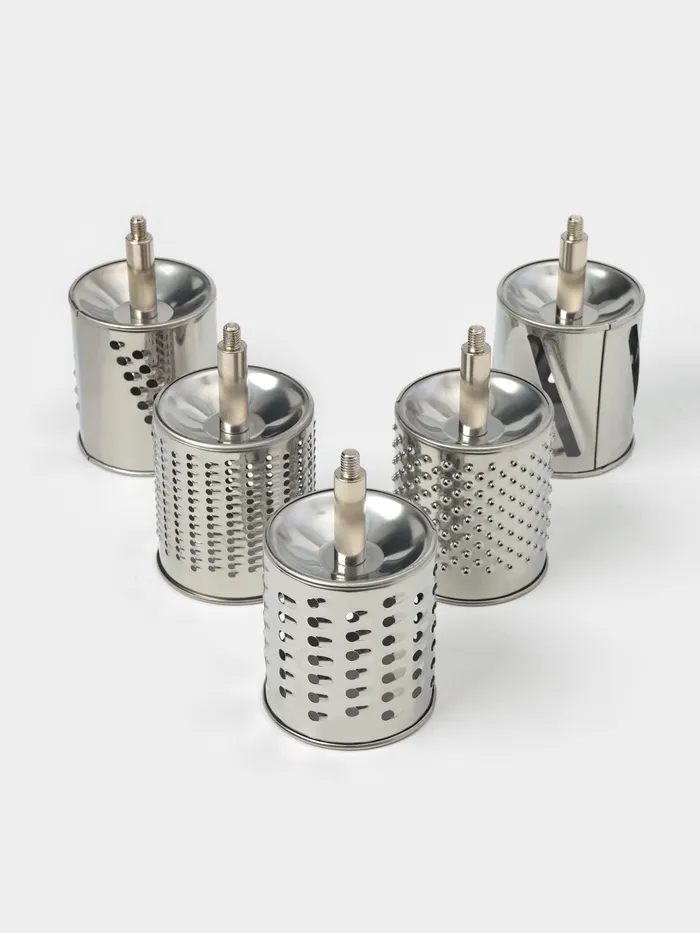 Благодаря широкому дозатору и 5 разным насадкам можно мелко натереть орехи, шоколад, сыр, порезать крупной соломкой или слайсами фрукты и овощи. Насадки легко снимаются и моются.